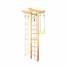 Конструкция выполнена из натурального дерева стойки и ступени, все края деталей немного скруглены обеспечивая большую безопасность для ребенка. Перекладины для навесного оборудования -металлические.
